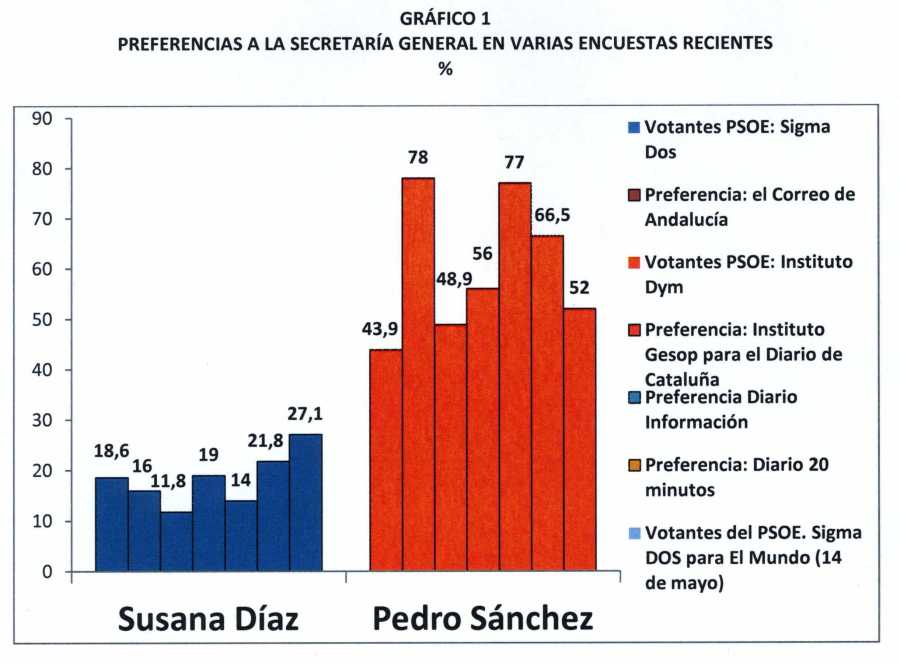 En lo que concierne al aspecto nuclear de cualquier proceso de primarias, los datos de todas las encuestas recientes coinciden en que Pedro Sánchez es el candidato preferido por los votantes y simpatizantes del PSOE, en una proporción que incluso dobla o triplica a la de Susana Díaz (vid. gráfico 1).
