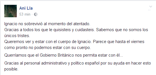«Ignacio no sobrevivió al momento del atentado», así ha confirmado a través de Facebook una de las hermanas de Ignacio Echeverría su muerte. A través de esta red social ha añadido que hasta el viernes no podrán ver el cuerpo: «Querríamos que el Gobierno Británico nos permita estar con él…».