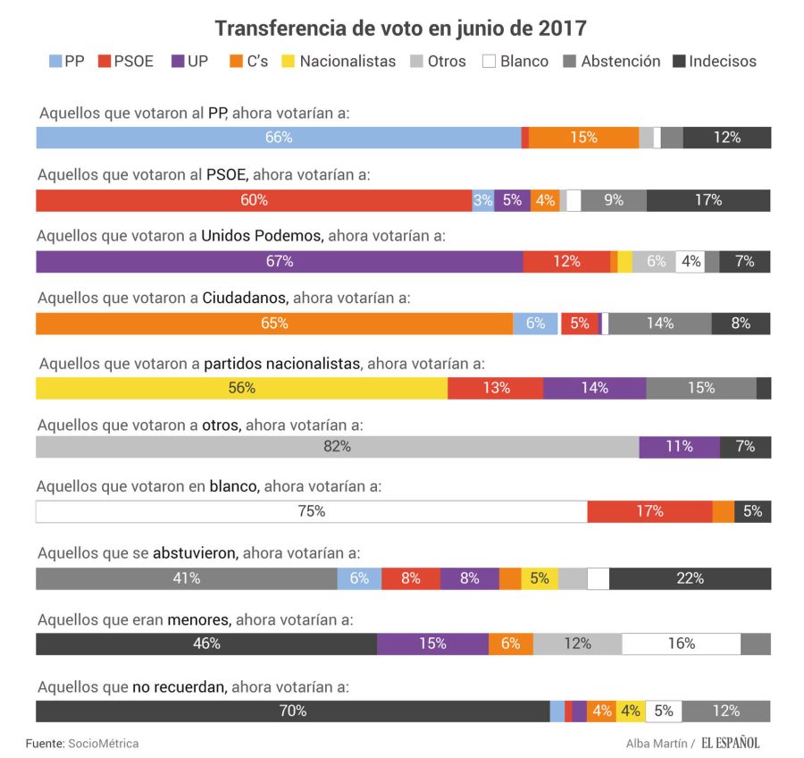 En cuanto a la transferencia de voto, empieza a advertirse el movimiento en las fuerzas de izquierda. Un 12% de las personas que votaron a Podemos en las anteriores elecciones elegiría ahora al PSOE. Sin embargo, según la encuesta, sólo un 5% de los que eligieron a Sánchez el 26-J se pasaría a Iglesias. Además, el 15% de los votantes del PP optaría ahora por Ciudadanos, mientras que sólo el 6% de los que votaron naranja se pasaría al PP.