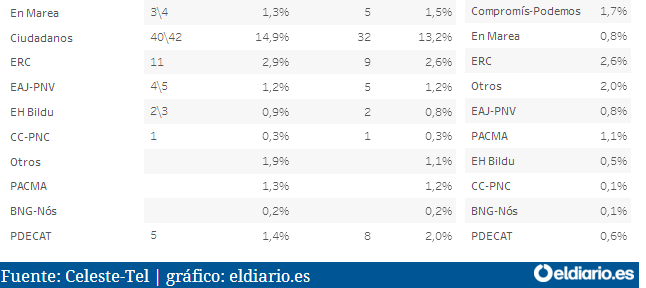 Con respecto al 26-J, el bloque de la derecha (PP + CS) pierde 0,5 puntos entre el electorado pero gana en conjunto entre 3 y 4 escaños. En el bloque de la izquierda (PSOE + Podemos y confluencias) se registra una caída en conjunto de 0,2 puntos y la pérdida de entre 3 y 4 escaños. Los ajustes en ambos bloques a nivel agregado no parecen importantes, pero sí lo son los descensos del PP (-2,1) y Podemos (-2,5) y los crecimientos del PSOE (+2,2) y de CS (+1,7). Ninguno de los dos bloques parecen tener asegurada una mayoría en caso de celebración de elecciones.