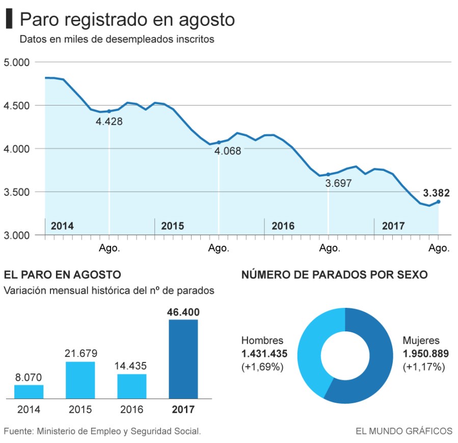 Así, el paro registrado en las oficinas de los servicios públicos de empleo (antiguo Inem) subió en el mes que acabamos de despedir en 46.400 personas tras seis meses consecutivos a la baja y se destruyeron 179.485 empleos. Se trata del peor agosto desde 2008 en términos de afiliación y desde 2011 en términos de paro . De este modo, el número de parados registrados se sitúa en 3.382.324 y el de afiliados en 18.309.844, según los datos publicados este lunes por el Ministerio de Empleo y Seguridad Social.