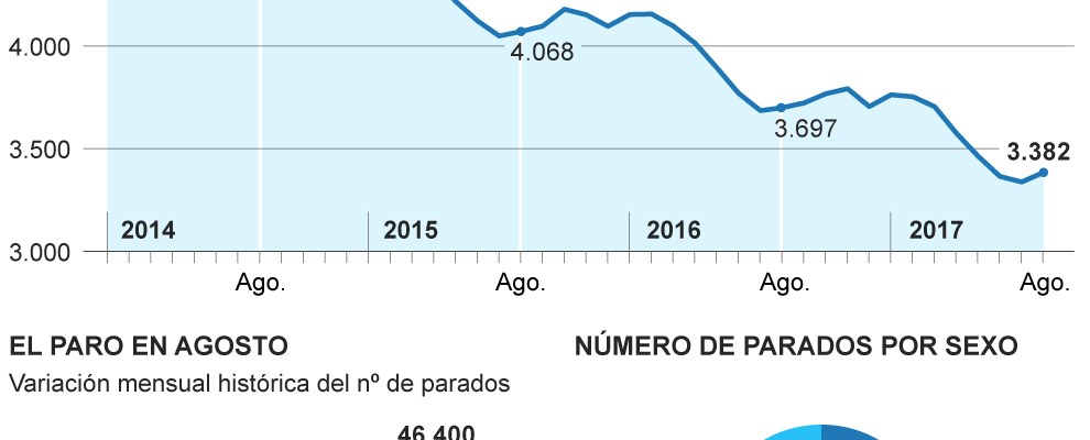 Así, el paro registrado en las oficinas de los servicios públicos de empleo (antiguo Inem) subió en el mes que acabamos de despedir en 46.400 personas tras seis meses consecutivos a la baja y se destruyeron 179.485 empleos. Se trata del peor agosto desde 2008 en términos de afiliación y desde 2011 en términos de paro . De este modo, el número de parados registrados se sitúa en 3.382.324 y el de afiliados en 18.309.844, según los datos publicados este lunes por el Ministerio de Empleo y Seguridad Social.