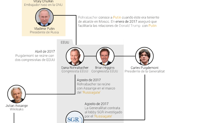 Como este mes de agosto, cuando la Generalitat contrató los servicios del ‘lobby’ estadounidense SGR Government Relations por 49.800 euros para “apoyar los esfuerzos de comunicación internacionales del ‘procés”. De nuevo se da la circunstancia, como pasa con Dana Rohrabacher, de que se trata de una firma que ha sido requerida para que aporte datos en la investigación del ‘Rusiagate’ en Estados Unidos, según publicó el ‘Washington Post‘.