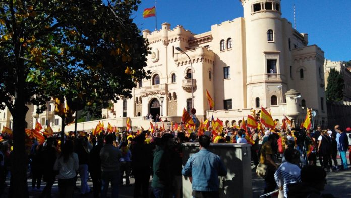 El cántico de “Yo soy español, español, español” ha sido el lema de la concentración espontánea, convocada en las redes sociales, ante el cuartel del Bruc para apoyar a las Fuerzas Armadas.