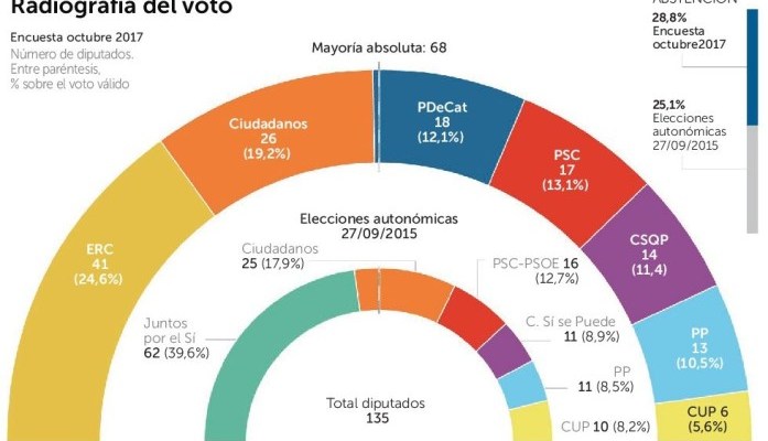 Según una encuesta de NC Report elaborada para este periódico entre los días 16 y 21 de octubre (de lunes a sábado de la pasada semana), el bloque independentista no alcanzaría hoy la mayoría absoluta con ninguna de sus combinaciones. La coalición de Junts pel Sí (que integra a ERC y al PDeCAT) obtendría 61 escaños en el caso de reeditarse –uno menos que hoy en día–, mientras que la CUP se haría con 6 diputados