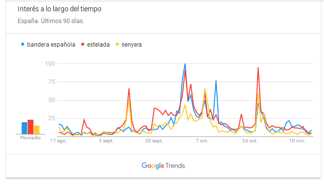 Entre las circunstancias que se han puesto de moda con motivo del desafío independentista destacan las banderas. Sí, las insignias españolas, la senyera catalana y las banderas esteladas están por todas partes, y eso se deduce con solo mirar las fachadas de las casas. El interés que generan se traslada a las búsquedas que se hacen en Google. A continuación, la gráfica de consultas de los últimos 90 días en España.