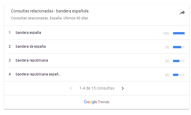 La concreción de Google a la hora de mostrar los datos permite averiguar aún más detalles sobre las búsquedas. Por ejemplo, en el caso de los que se interesaron por la bandera española, las consultas relacionadas van desde la bandera republicana a la bandera franquista, pasando por una sucesión de palabras muy simbólica y pacífica que podría servir de solución al conflicto que vive actualmente España: «bandera española y catalana juntas».