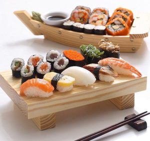 El sushi es un plato de origen japonés basado en el arroz que se acompaña con sésamo, salmón o trucha. Dependiendo de los gustos puede servirse crudo o cocido, y se adoba con vinagre de arroz, azúcar, sal. Se le agregan otros ingredientes, como verduras, pescados o mariscos. Este plato es uno de los más populares en todo el mundo. El sushi se prepara generalmente en raciones pequeñas, aproximadamente del tamaño de un bocado, y puede adoptar diversas formas. Si se sirve el pescado y el arroz enrollados en una hoja de alga nori se le llama maki (‘rollo’). Si se trata de una especie de albóndiga de arroz cubierta por el pescado hablamos de nigiri. Cuando el arroz se presenta embutido en una pequeña bolsa de tofu frito se denomina inari. -