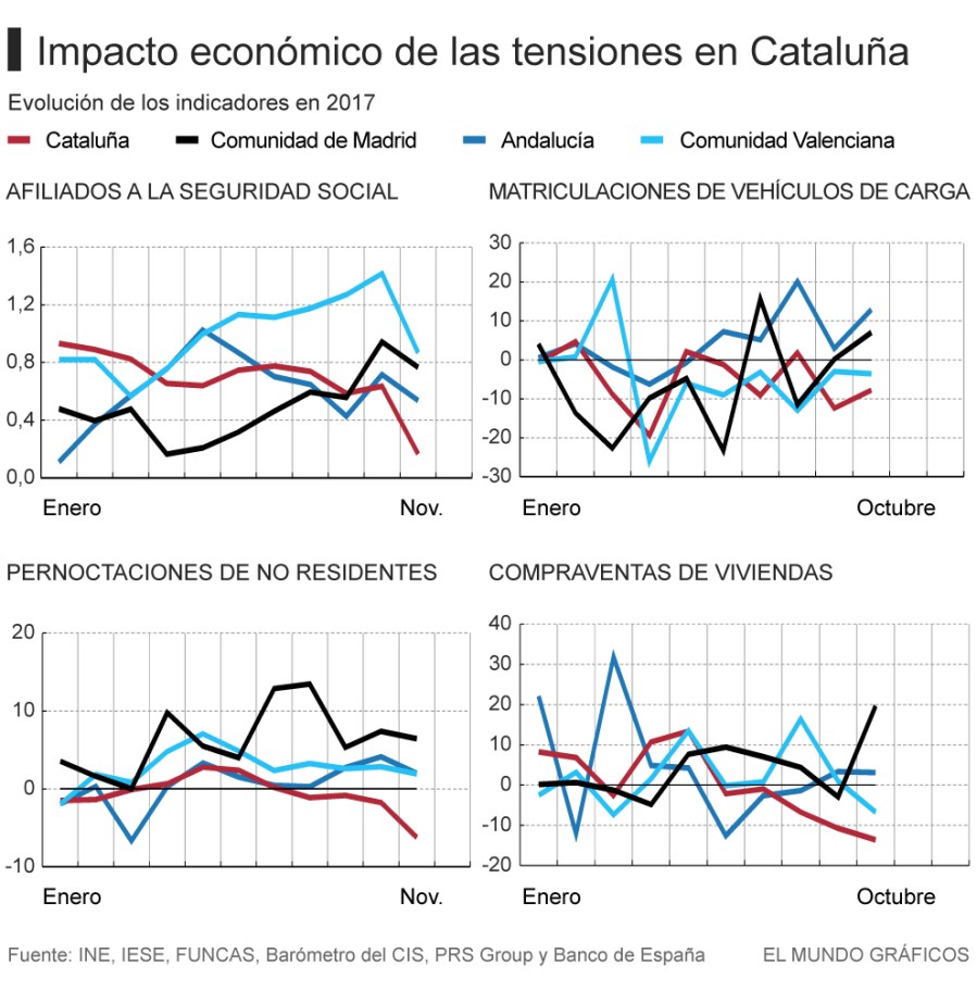 Los técnico del BdE apuntan que «la información coyuntural acerca de la actividad económica relativa al trimestre en curso en el conjunto de España y en las distintas CCAA es todavía incompleta», y que se registró un aumento de incertidumbre económica en octubre que remitió «parcialmente» en noviembre, que fue cuando se aplicó el artículos 155. Pero aun así, mantienen que Cataluña ya está sufriendo las consecuencias negativas del desafío secesionista.