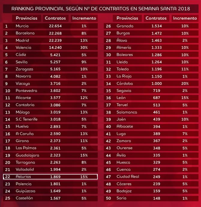 - Las provincias que experimentarán un mayor crecimiento interanual en el número de contratos de Semana Santa serán Valencia, con un 30%, Córdoba, con un 20%, y Asturias, Guadalajara y León, con un 15% cada una de ellas.