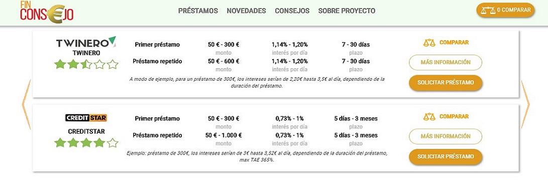 Entre estos comparadores de préstamos destaca un nuevo servicio español, finconsejo.es, con su página https://finconsejo.es/prestamos, donde se pueden contrastar los mejores préstamos rápidos que se ofrecen en internet. Finconsejo ha recopilado los préstamos de más de 40 entidades y explica en detalle en su comparador todas sus características (tipo de interés, vinculaciones, comisiones…)