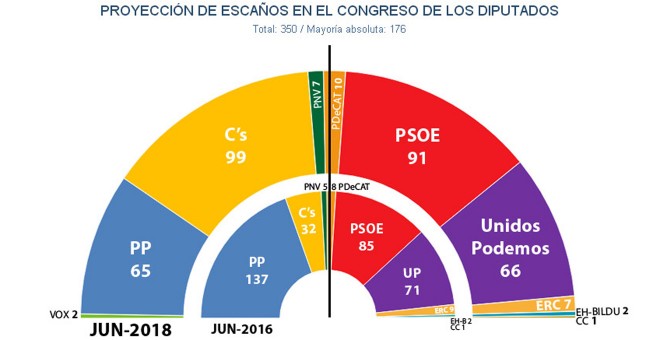 El mapa político ha cambiado radicalmente y para siempre en España. La moción de censura que derribó el Gobierno de Mariano Rajoy no sólo acabó con su carrera y dejó vacante el liderazgo del gran partido derechista, sino que dañó electoralmente al Partido Popular, que no sólo quedaría cuarto si hoy se celebrasen elecciones generales, sino que incluso vería surgir en el Congreso a su derecha –por vez primera desde el fin del franquismo– un nuevo rival parlamentario a su derecha: VOX, con dos escaños.