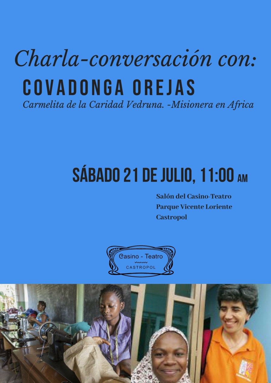 Este próximo sábado 21 de julio de 2018 a las 11:00 tendrá lugar en el edificio del Casino de Castropol una charla/conversación con Covadonga Orejas. Misionera en África durante más de 12 años y actualmente involucrada en diferentes proyectos ya desde España .