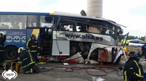 El autobús, de la compañía Alsa, se ha quedado completamente empotrado contra una columna de hormigón, por lo que el número de heridos podría ser elevado, algunos de ellos de gravedad. Los vecinos de las zonas colindantes calificaron el choque de «brutal». Antes de impactar el autobús contra el pilar, se llevó por delante barreras de obras durante unos cien metros.