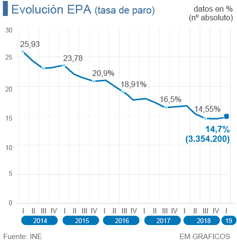 La tasa de paro aumentó en el primer trimestre del año hasta situarse en el 14,7% (25 centésimas más que en el trimestre anterior) y el número de parados subió en 49.000 personas, hasta alcanzar los 3.354.200 de desempleados. Se trata del peor dato desde 2013 en este trimestre.