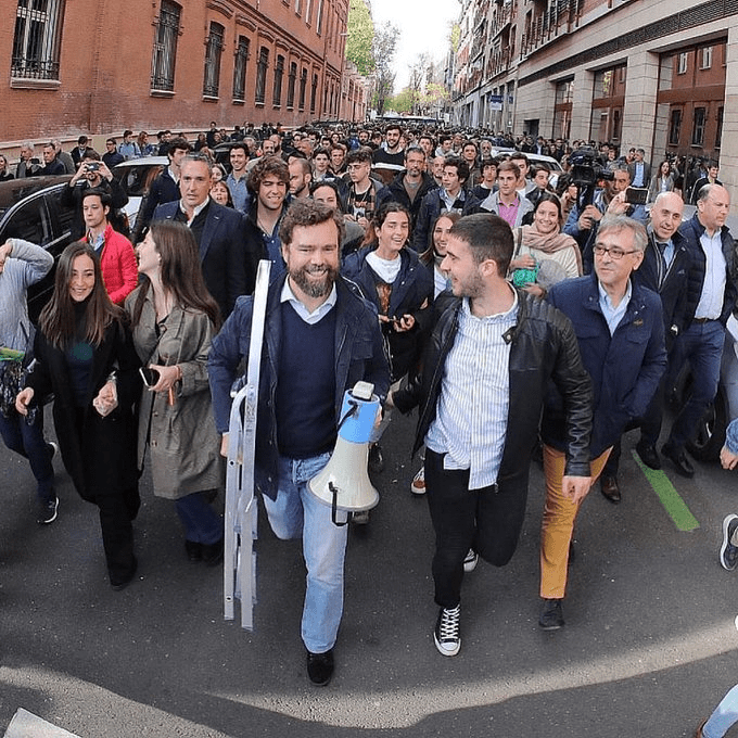 Esta es la mejor imagen de campaña, Iván Espinosa de los Monteros VOX con una escalera y un megáfono y detrás de él miles de Jóvenes convocados el día anterior.