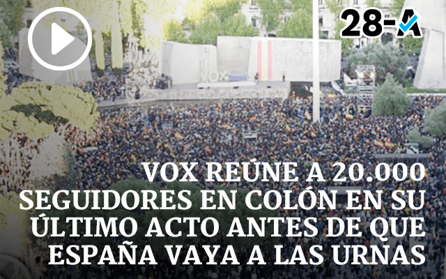 Ante una plaza de Colón enfervorizada, a la que se han acercado 20.000 simpatizantes de Vox, Santiago Abascal ha realizado su discurso de cierre de campaña. El líder de Vox ha avisado de que el 28-A se decide mucho más que un Gobierno. “O el pacto de la traición o una alternativa patriótica”, ha advertido sobre el futuro de España. Abascal ha recalcado que “el próximo 28 de abril nos jugamos el futuro de España. O la desaparición o la continuidad histórica de nuestra patria. O miseria socialista o prosperidad de nuestros hijos y nietos”.