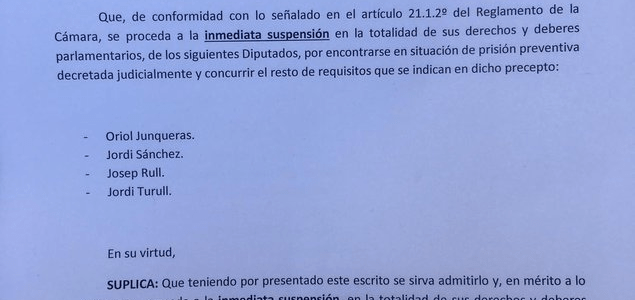 VOX 🇪🇸 (@vox_es) twitteó: 🚨 VOX registra en el Congreso una solicitud de suspensión inmediata de derechos y deberes parlamentarios de los golpistas separatistas, firmada por @Santi_ABASCAL. Hay que impedir que se repita la ignominia de contar en las Cortes con criminales presos. 📢🇪🇸 #PorEspaña ⬇⬇⬇ https://t.co/hElHBYhJpO https://twitter.com/vox_es/status/1130827030419976192?s=17