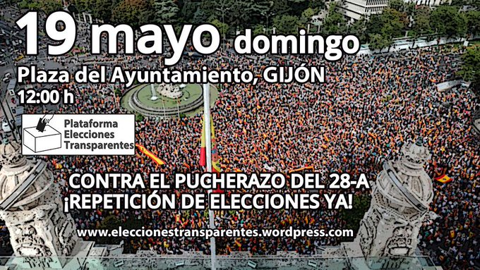Gijon, domingo 19 de Mayo, Sal a la calle, Defiende la DEMOCRACIA, contra #Pucherazo28A, REPETICIÓN de elecciones. Móvil contacto 605 94 02 35 y rafapal69@gmail.com «No te mereces un Gobierno que te mienta» Te suena ésta frase? Experta @AnaMercedesDiaz «FRAUDE ELECTORAL sin duda» https://t.co/oPocMCBSoL https://twitter.com/adelantevox28A/status/1128407165331476485?s=17