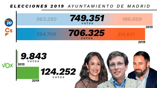 Los 43.000 votos que la suma del PP y Ciudadanos han perdido respecto a 2015 ha sido absorbida por Vox y la ha multiplicado hasta los 124.252. De tal forma que, se puede concluir, la lista verde ha sido decisiva para derrocar a la izquierda madrileña de las urnas.