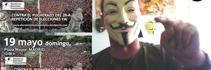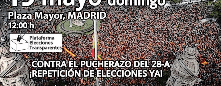 La Plataforma por unas Elecciones Transparentes ha convocado concentraciones en toda España para el domingo 19 de mayo a las 12 horas, para pedir la repetición de las elecciones del pasado 28 de abril y por unas elecciones transparentes y limpias. Argumentan que se cometió una “flagrante manipulación del resultado electoral”. En Madrid la cita… Leer más Ya son 35 las ciudades españoles que protestarán el domingo 19 de mayo a las 12 contra el pucherazo de las elecciones generales. Reclaman que se repitan y que esta vez sean elecciones limpias