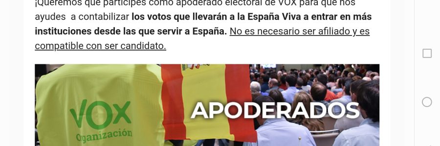 MENSAJE DE VOX. – Estimado compatriota: ¡Te necesitamos! ¡España te necesita! En las pasadas Elecciones Generales quedó muy claro que es imprescindible observar y controlar las mesas electorales para prevenir posibles irregularidades, ya que en el recuento oficial de los votos por parte de las Juntas Electorales Provinciales, se observaron que muchos votos quedaron no… Leer más VOX llama a rebato a todos los españoles para que acudan de apoderados en las elecciones del 26 de mayo para impedir que Pedro Sánchez perpetre otro pucherazo