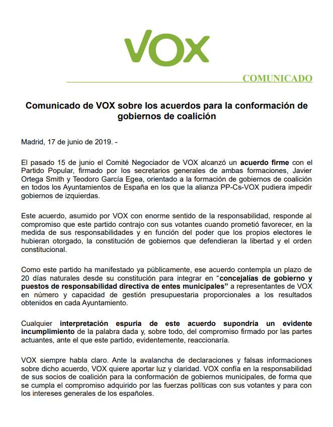 🚨 Comunicado de VOX sobre los acuerdos para la conformación de gobiernos de coalición.
