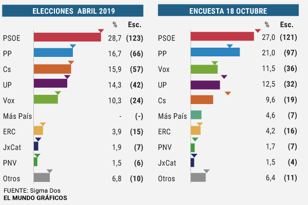 El tracking de Sigma Dos para EL MUNDO muestra un fotograma, a 18 de octubre, en el que los socialistas continúan deslizándose cuesta abajo, perdiendo ya dos escaños respecto a los que lograron el 28-A.