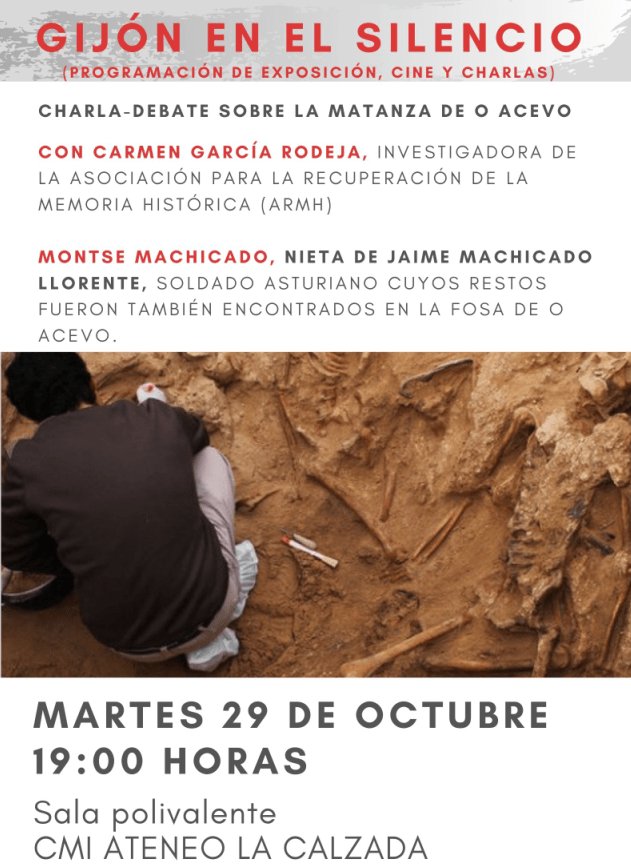 La investigadora Carmen García-Rodeja de la ARMH ( Asociación para la Recuperación de la Memoria Histórica) dará una charla en Xixón en el Ateneo de la Calzada (c/ Ateneo obrero s/n) el martes dia 29 a las 7 de la tarde, con el título «La matanza de O Acevo: El batallón de republicanos asesinados por franquistas que se convirtió en un poema prohibido»