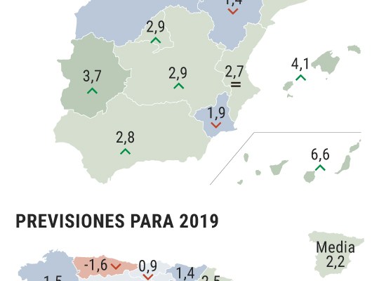 Es más, Canarias apenas avanzará un 1,1% en 2020; Islas Baleares sólo podrá crecer un 1,2%; el mencionado Principado de Asturias se quedará en el 1,3%; y la Comunidad Valenciana y la Región de Murcia alcanzarán el 1,4%. Cataluña, el gran motor económico de España junto a Madrid, se quedará en un 1,8% este año, lo que supondría estar por debajo del 1,9% previsto para el conjunto del país, e igualaría la media nacional en 2020 con un 1,6%.