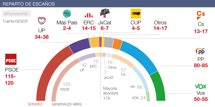 Además, Vox se propulsa a partir de la debacle de Ciudadanos, que pasaría de 57 a 13-17 representantes. Al partido de Albert Rivera le superaría Unidas Podemos, con 34-38 escaños, un resultado medio punto inferior al que le pronosticaba el GESOP en su última encuesta en España. Pero a Cs podría superarle incluso ERC, que se sitúa en 14-15 escaños. Más País, el partido de Íñigo Errejón, mantiene sus opciones de debutar en el Congreso con 2-4 diputados.