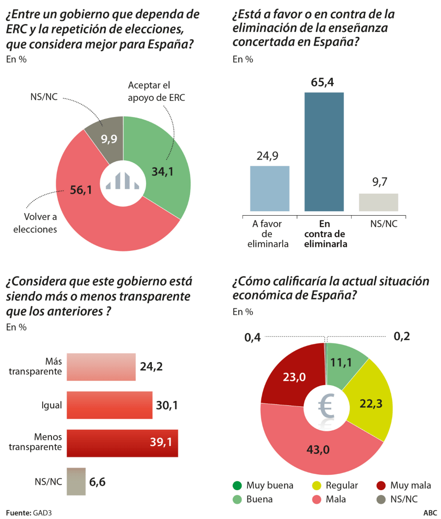 En el barómetro de GAD3 se pregunta a los entrevistados qué consideran mejor para España, un Gobierno que dependa de ERC o la repetición de las elecciones. Casi seis de cada diez (el 56,1 por ciento exactamente) prefieren volver a las urnas por tercera vez en menos de un año antes que dejar España en manos de Junqueras y Rufián. El 34,1 por ciento opta por poner en primer lugar el acuerdo de los socialistas con los independentistas catalanes. El 9,9 por ciento no sabe o no contesta.