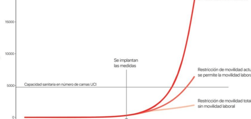 “El riesgo de saturación de nuestro sistema de salud ―definido como capacidad de ingreso en UCI― es muy alto. Las intervenciones de control de la transmisión nos alejan del riesgo de atravesar el techo de colapso sanitario en los próximos días. Con una restricción de movilidad parcial, como la actual, estimamos que se alcanzaría el punto de saturación del sistema sanitario alrededor del 25 de marzo. Esto se podría evitar si la restricción de la movilidad fuera total y se decretara sin demora”, concluye el informe.
