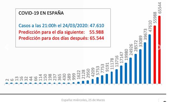 SANTIAGO. El aumento exponencial de casos llevaría a España a sumar, en la jornada de este jueves, un total de 65.544 contagiados. Así lo afirman, al menos, físicos gallegos e investigadores de la escuela de Ingeniería Aeronáutica de la Universidad de Vigo, quienes han desarrollado una herramienta para poder predecir cuál será el numero de contagios a dos días vista. Aunque con posibilidad de corrección con la actualización de los datos a las 21 horas de cada jornada, Humberto Michinel, responsable del estudio y catedrático de la UVigo, asegura que estas predicciones pueden llegar a tener una fiabilidad del «95%». El método utilizado, la curva Gompertz, es uno de los más comunes para analizar la evolución de epidemias.