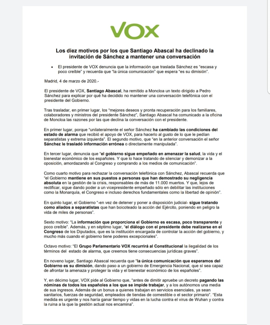 Por primera vez he declinado la conversación telefónica con el señor Sánchez por las 10 razones que aquí se detallan y que hemos trasladado al Palacio de La Moncloa.
