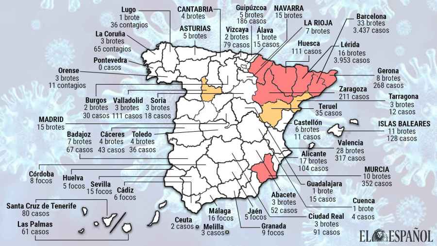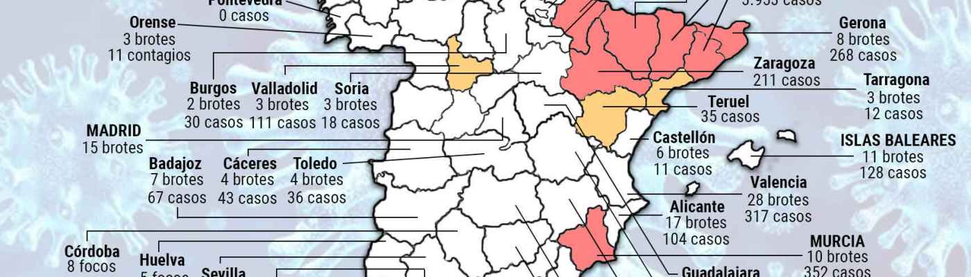 Además, mantiene los que son ya los focos más preocupantes del país. El primero se encuentra localizado en la comarca de El Segriá (Lérida), con 16 brotes activos que han llevado a las autoridades a confinar a la población (el pasado 23 de julio) con el fin de tratar de contener el contagio. La localidad limítrofe con Aragón cuenta ya con más de 3.953 casos y dos personas han fallecido hasta la fecha.
