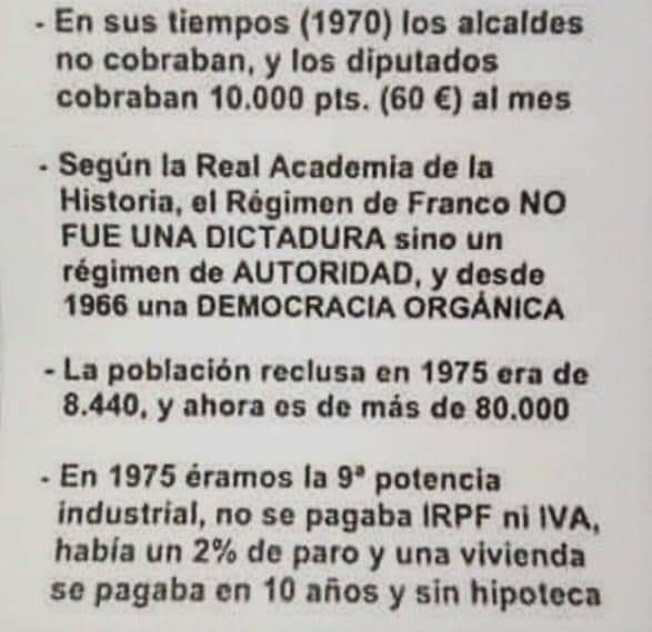 Cuando quieran, hacemos un balance de los 40 años de Franco, lo que hizo : crear la ss , las vacaciones pagadas, las pagas extras, las pensiones, las pensiones de viudedad, los pisos de protección oficial,las carreteras nacionales, el ferrocarril (el ave evidentemente no) la mayoría de los hospitales grandes en toda España, la mayoria de institutos y colegios en toda España, las únicas centrales nucleares que existen (y dan luz a toda España a día de hoy), los famosos pantanos (no tendriamos agua a dia de hoy), la mayoría de centrales termicas ,los principales aeropuertos, los principales puertos, el inicio de la industria española, y un largo etc que me da pereza.