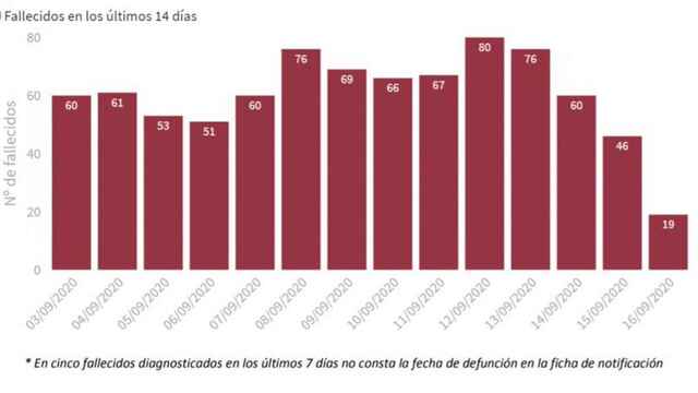 De ahí que las cifras que recoge el ministerio en su PDF haya que cogerlas siempre con pinzas. En la actualidad, por ejemplo, Sanidad hace constar 419 fallecidos en los últimos 7 días y 849 en los últimos 14, con picos de 80-85 muertos diarios.