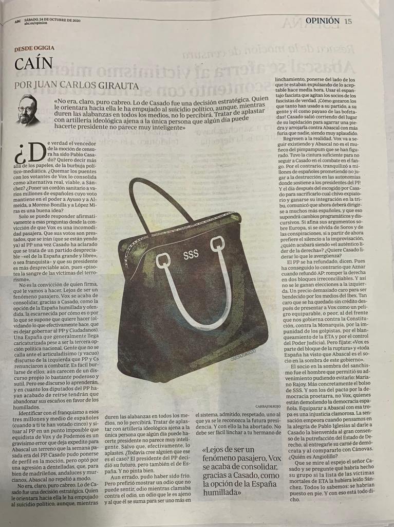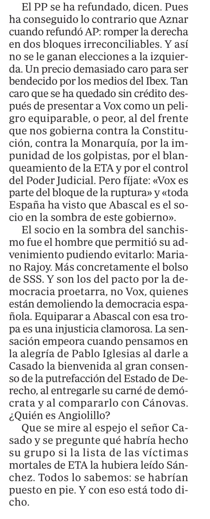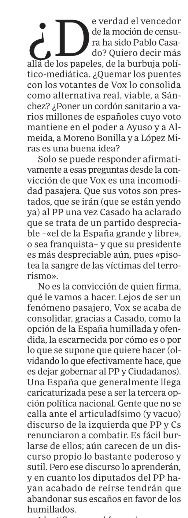 «No era, claro, puro cabreo. Lo de Casado fue una decisión estratégica. Quien le orientará hacia ella le ha empujado al suicidio político, aunque mientras duren las alabanzas en todos los medios, no lo percibirá. Tratar de aplastar con artillería ideológica a la única persona que algún día puede hacerte presidente no parece muy inteligente».