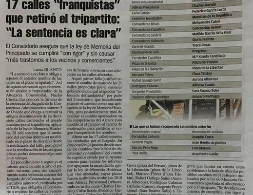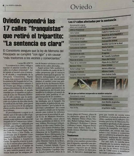 Otro fallo judicial anterior obligaba al Consistorio a restituir las calles de Fernández Ladreda, General Yagüe, Marcos Peña Royo y Yela Utrilla. La des-memoria histórica de la tiranía sociocomunista no ha podido con la Muy Noble, Invicta, Benemérita y Leal Ciudad de Oviedo. Los ovetenses han logrado recuperar sus calles de siempre.