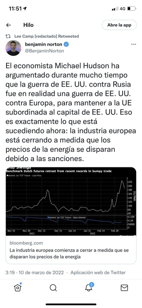 El economista Michael Hudson ha argumentado durante mucho tiempo que la guerra de EEUU contra Rusia fue en realidad una guerra de EEUU contra Europa, para mantener a la UE subordinada al capital de Estados Unidos. Eso es exactamente lo que está sucediendo ahora: la industria europea está cerrando a medida que los precios de la energía se disparan debido a las sanciones.