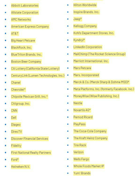 Entre otras, algunas de las compañías que boicotean Twitter porque ha vuelto a admitir cuentas que no son globalistas y que estaban censuradas por el único pecado de expresar sus valores conservadores: American Express, AT&T, BlackRock, Balenciaga, Citigroup, CNN, Dell, DirecTV, Discover, HP, LinkedIn, Facebook, Nestle, Coca-Cola, Kraft Heinz, Verizon, Wells Fargo