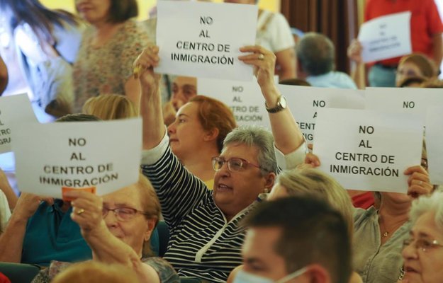«¿Pero sabe usted cuántos en esta sala están en el paro y no pueden pagarse un gimnasio?», le interrumpió un vecino. Le siguen decenas de frases igual de lapidarias aquí y allá, entre vecinos que portan cada uno, un cartel que reza: «¡No al centro de inmigración».