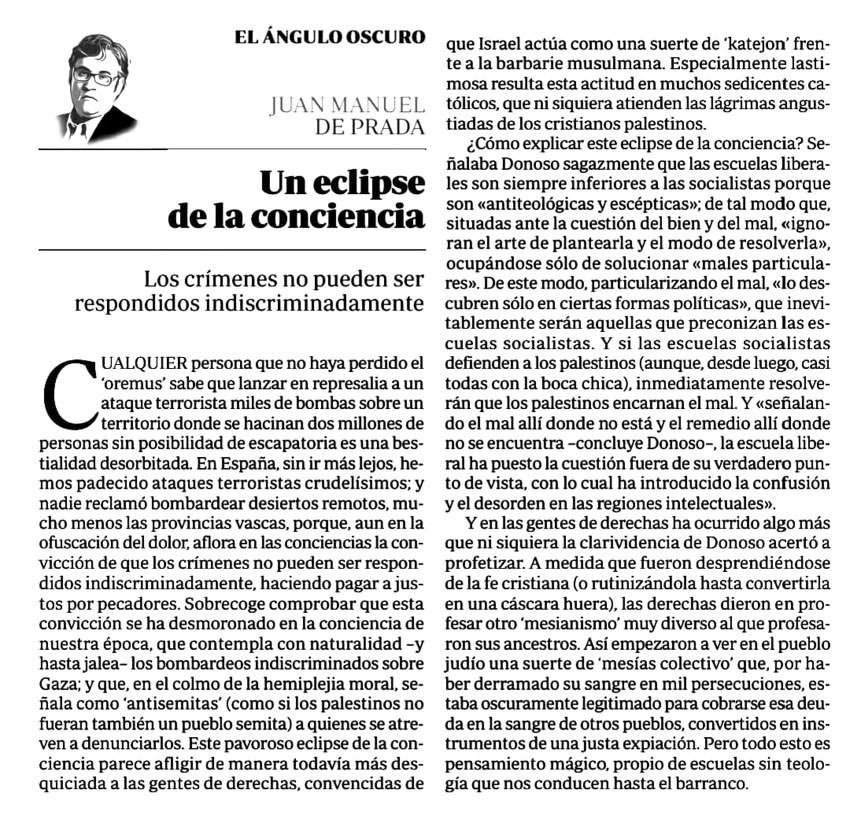 «Este pavoroso eclipse de la conciencia parece afligir de manera todavía más desquiciada a las gentes de derechas, convencidas de que Israel actúa como una especie de ‘katejon’ [obstáculo] frente a la barbarie musulmana. Especialmente lastimosa resulta esta actitud en muchos sedicentes católicos, que ni siquiera atienden las lágrimas angustiadas de los cristianos palestinos».