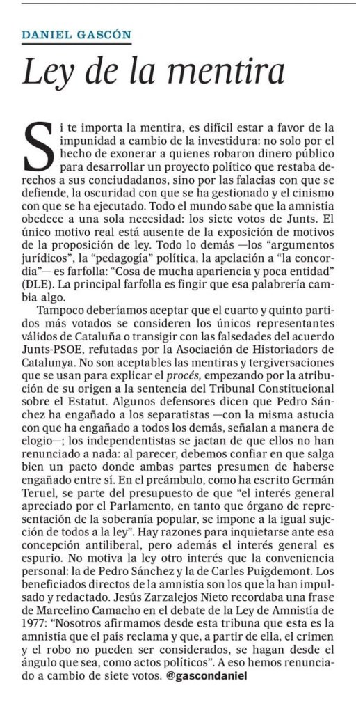 Artículo sobre la amnistía: que no os cuenten milongas. La amnistía se forjó hace meses como acaban de reconocer en el PSOE, simple y llanamente para que Sánchez se aferre al poder, y con sus socios delincuentes acabe con España de manera definitiva, para que nunca más pueda volver a levantarse y ser un riesgo para los poderes globales