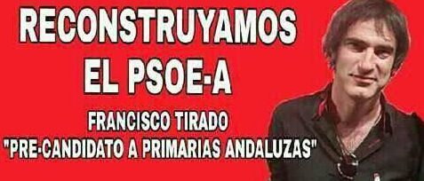FRANCISCO TIRADO, EL ÚNICO CANDIDATO ANDALUZ A LAS PRIMARIAS QUE TIENE QUE REUNIR 5.000 AVALES DE SU REGIÓN EN 10 DÍAS PARA PODER ENFRENTARSE EN LAS URNAS AL APARATO CADUCO Y OLIGÁRQUICO DEL PSOE ANDALUZ, EN UN INTENTO DE RENOVACIÓN A LA DESESPERADA. «Porque si seguimos con esta señora, perdemos Andalucía en las próximas generales… Leer más Francisco Tirado se presenta como único contricante de la Zultana tras leer una carta de apoyo de otro militante, Enrique Pérez Romero, que se presenta a las primarias extremeñas: «Es un orgullo poder servir de avanzadilla para lo que quizá surja pronto en otros territorios y, si no, aunque sea tarde, surgirá. (…) Ojalá que se abran procesos parecidos en todas partes, y ojalá que este debate abierto en Extremadura nos lleve al mejor puerto posible tras el mar embravecido»